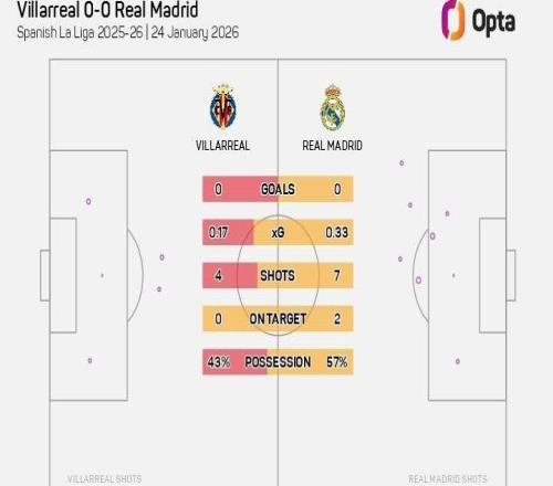 西甲第21轮,皇家马德里客场对阵比利亚雷亚尔,上半场战罢,比分为0-0,据统计,皇马是2026年五大联赛唯一上半场还没有被射正的球队。此役客场对阵比利亚雷亚尔,皇家马德里完成7次射门